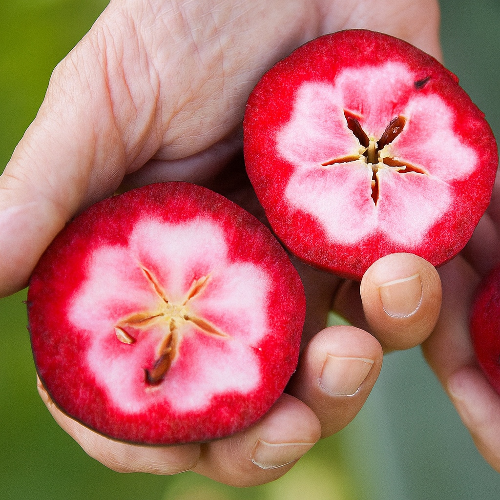 Це яблуко не схоже на жодне інше. Усередині — соковите рожеве серце, яке виглядає так, ніби його створила сама природа для натхнення. Кожен укус — вибух солодкого смаку з легкою ягідною ноткою, що залишає відчуття свіжості й радості.