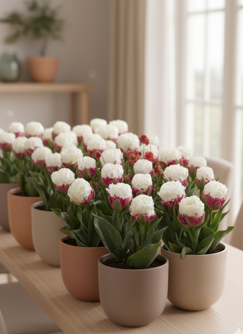 Для успішного вирощування тюльпанів «Ice Cream» у кімнатних умовах оберіть світле місце з м’яким, розсіяним освітленням.