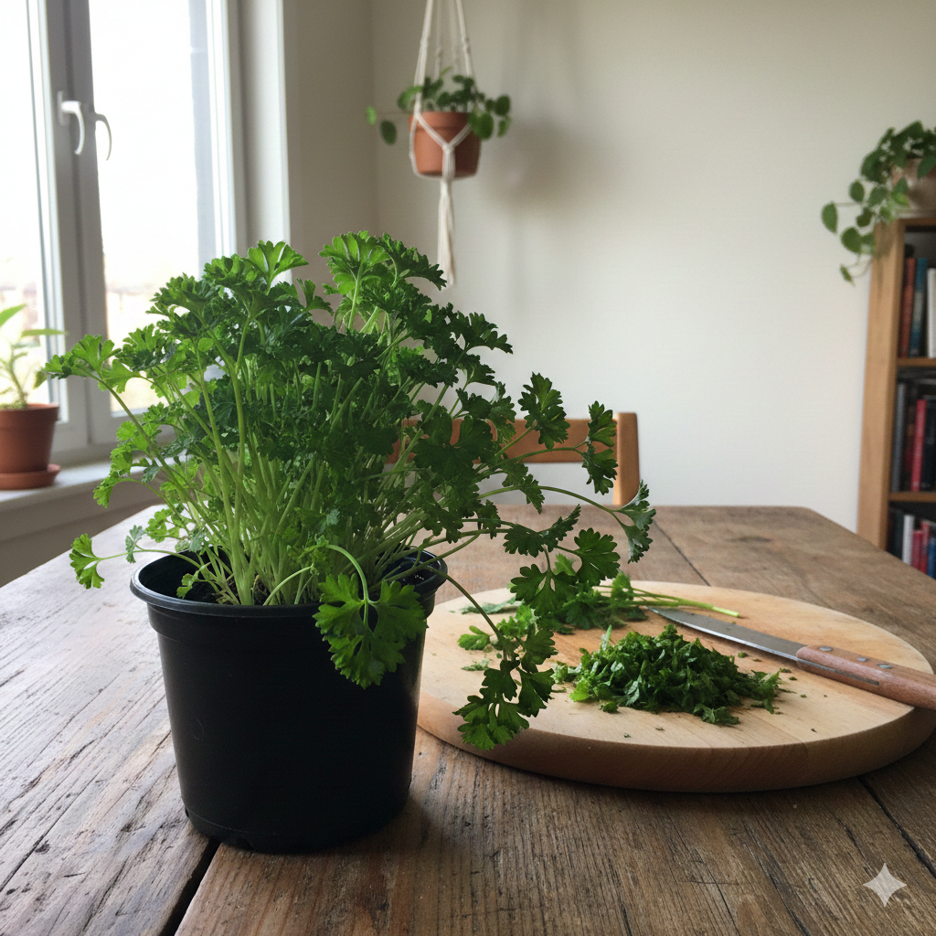 Пишна, соковита та дуже ароматна. Ця петрушка росте густо і швидко відновлюється після зрізання. Ідеальна для супів, салатів, м’яса й щоденних страв. У кімнатних умовах формує міцні листочки та тримає аромат краще, ніж магазинна. Ви зрізаєте частину — і зелень знову відростає хвилями.